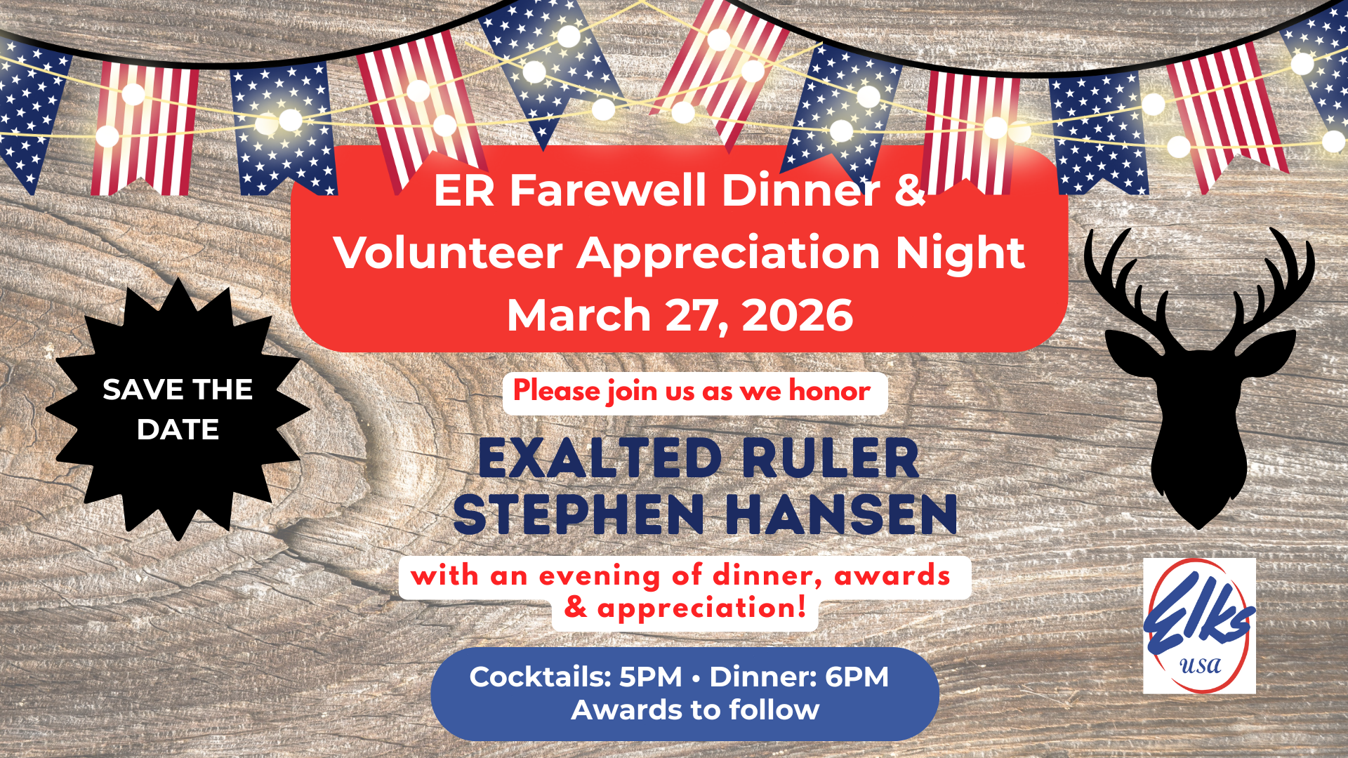 Please join us as we honor Exalted Ruler Stephen Hansen with an evening of dinner, awards, and appreciation!