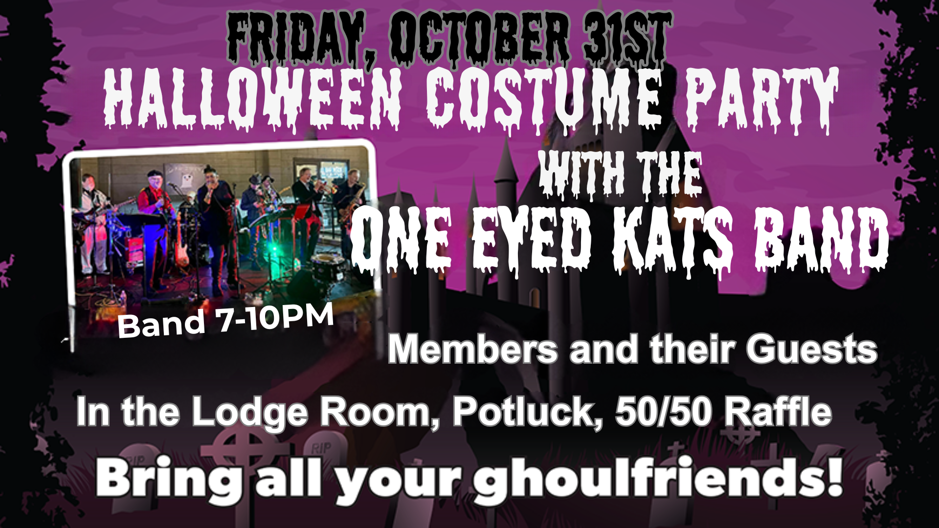 Get your best costume ready — we’ll have a costume contest, 50/50 raffle, and live music from the always entertaining One-Eyed Kats Band!