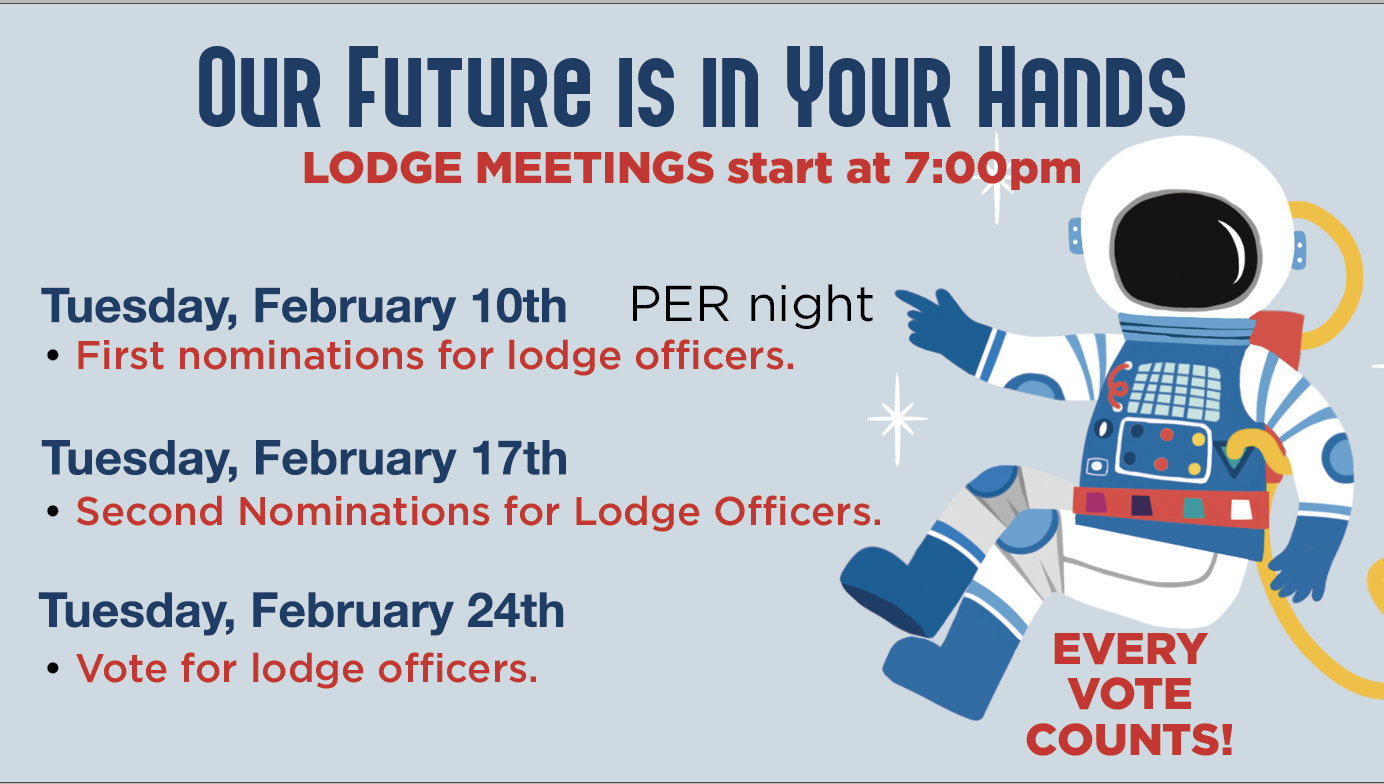 Lodge Meeting 7PM – 1st Nominations (PER Night)