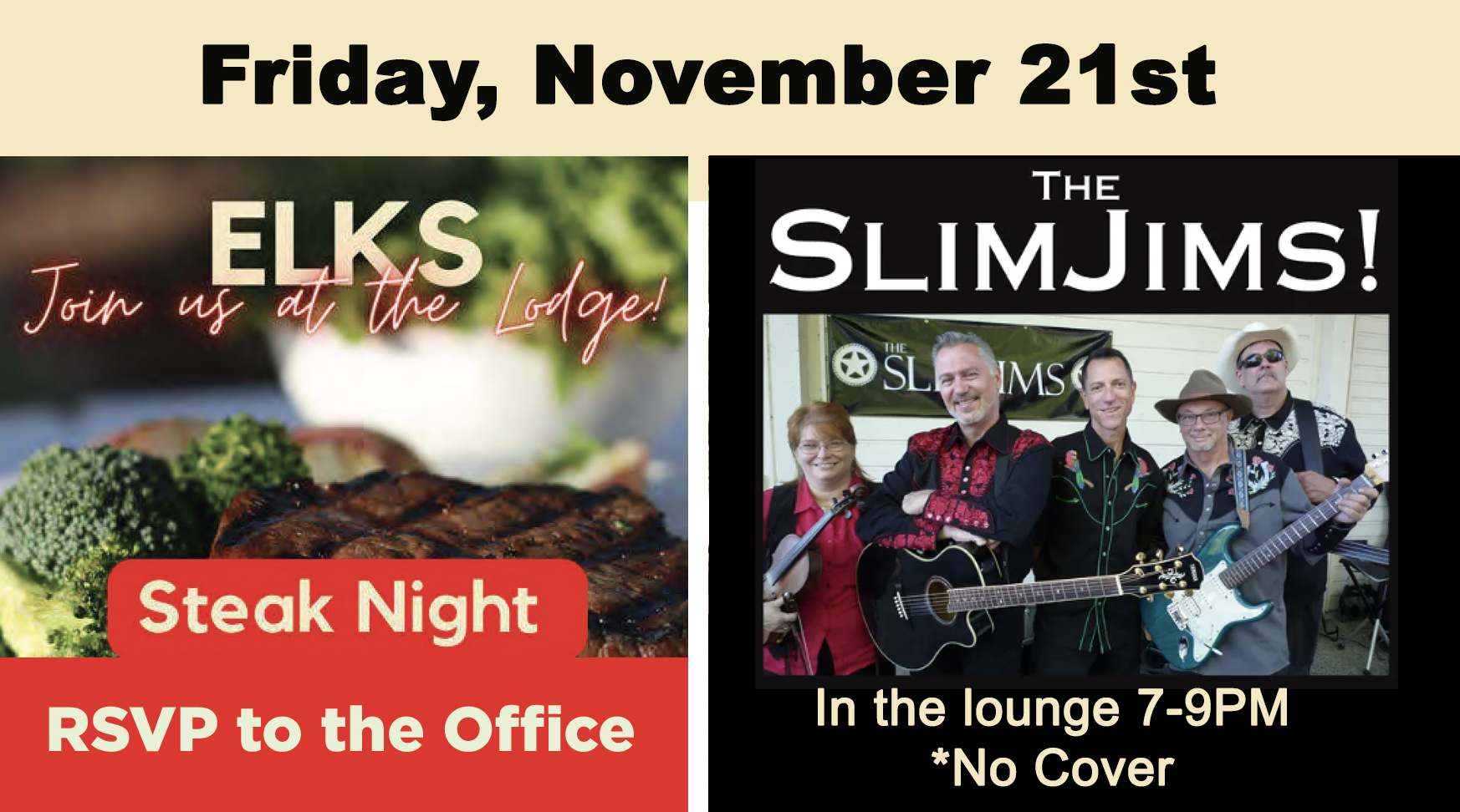 Officer Steak Night 5PM, Live Music by Slim Jims