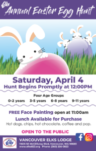 🐣🌷 Join Us for the Annual Elks Easter Egg Hunt! 🌷🐣 Mark your calendars for April 4th and bring the whole family out for a fun-filled day! 🎨 Free Face Painting begins at 11:00 AM🌭 Lunch Available for Purchase – Hot dogs, chips, hot chocolate, and sodas Come early to grab a bite, get your child’s face painted, and explore some of the great resources we have available! 🥚 Easter Egg Hunt starts promptly at 12:00 PMWe’ll have multiple age…