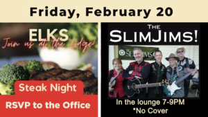 Steak $27 comes with a salad, baked potato, and vegetables. Or select Fish, $25: Salmon with a salad, baked potato, and vegetables. *The steak will be upgraded to Ribeye from Sirloin, 8-oz portion. Please call the office to make your reservations by Wednesday. When you call, please select an open time for dinner. *Late RSVPs may not be taken. 360-256-0823 Live Music by Slim Jims (in the Lounge) at 7 PM *No cover for the band. *Steak Night Tips and…