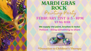 Mardi Gras Rock Painting Party! Saturday, February 21 • 5–8 PMIn the Stag Bar Come hang out with fellow Elks and get creative painting rocks with fun Christmas themes!No experience needed — we’ll have supplies ready, bring your imagination and a smile. It’s a Potluck! Bring a dish to share while you paint and mingle. Donations accepted for Children’s Therapy. Let’s relax, create, and celebrate the cozy season together.