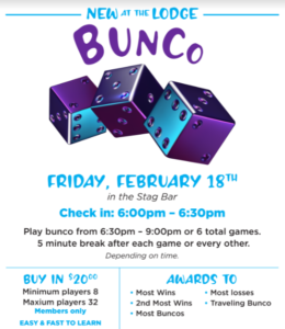 We are starting a monthly Bunco game! Check-in 6-6:30 PM Playing 6:30-9PM (6 games). Buy-in $20 Minimum players 8, maximum players 32. *At this time, members-only (& spouses) can attend. It will be in the Stag Bar. Come early and have dinner. Steak Night will be going on in the lounge.