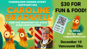 Join us in a fundraiser for Caroline Bradwell's WSEA Presidential Year! You’re invited to a special fundraising evening in support of South District VP Caroline Bradwell for her Presidential Year in WSEA. Date: Wednesday, December 10, 2025 Location: Vancouver Elks Lodge #823 Schedule: 5:30–6:00 PM – Cocktails 6:00–7:00 PM – Dinner & Dessert 7:00–9:00 PM – Wine-O Bingo, Raffles & Door Prizes Early Bird Special:$30 until 12/2After 12/2: $35 Get your tickets in the office or here: https://www.zeffy.com/en-US/ticketing/fundraising-event-for-caroline-bradwell Each ticket includes a delicious dinner,…